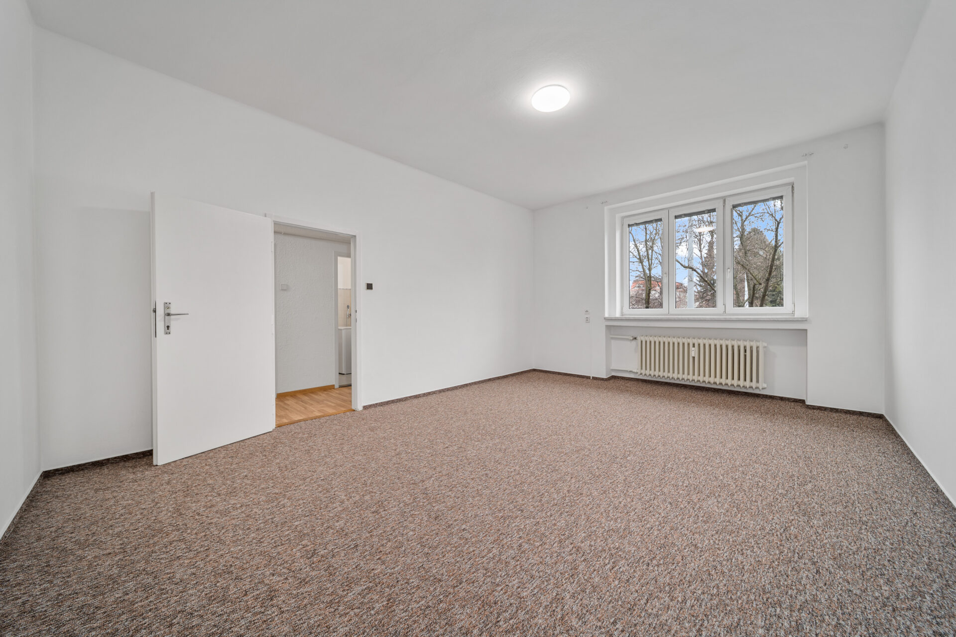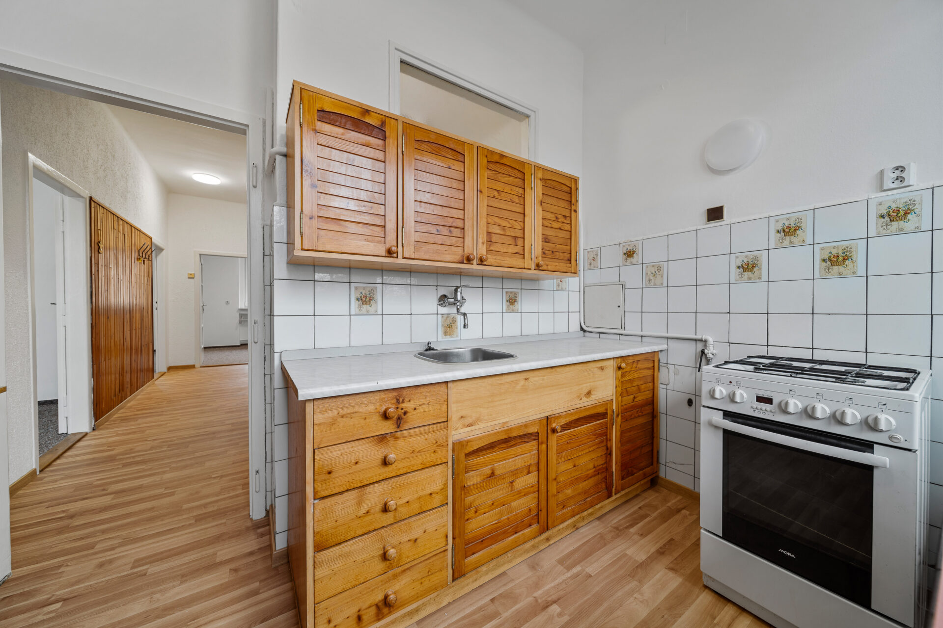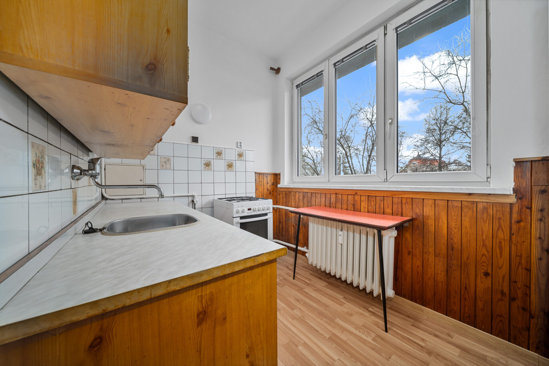 V chodbě dále naleznete praktickou komoru s dostatkem úložného prostoru, samostatné WC a koupelnu s vanou. Hlavní dominantou bytu je vzdušný a prosvětlený obývací pokoj. Hned vedle se nachází samostatná kuchyně. Velkým bonusem je, že příčka mezi kuchyní a obývacím pokojem není nosná – nabízí se tedy možnost jejich propojení a vytvoření moderního, otevřeného prostoru podle vašich představ.