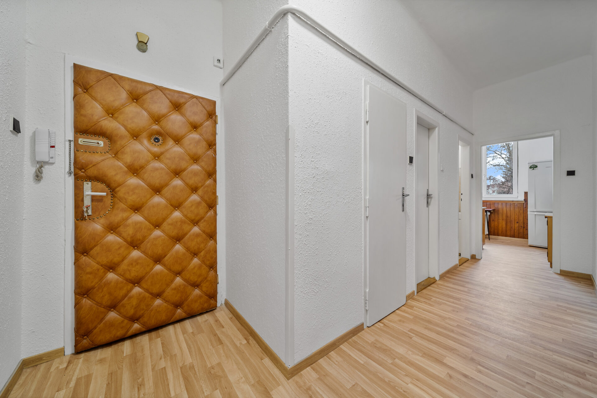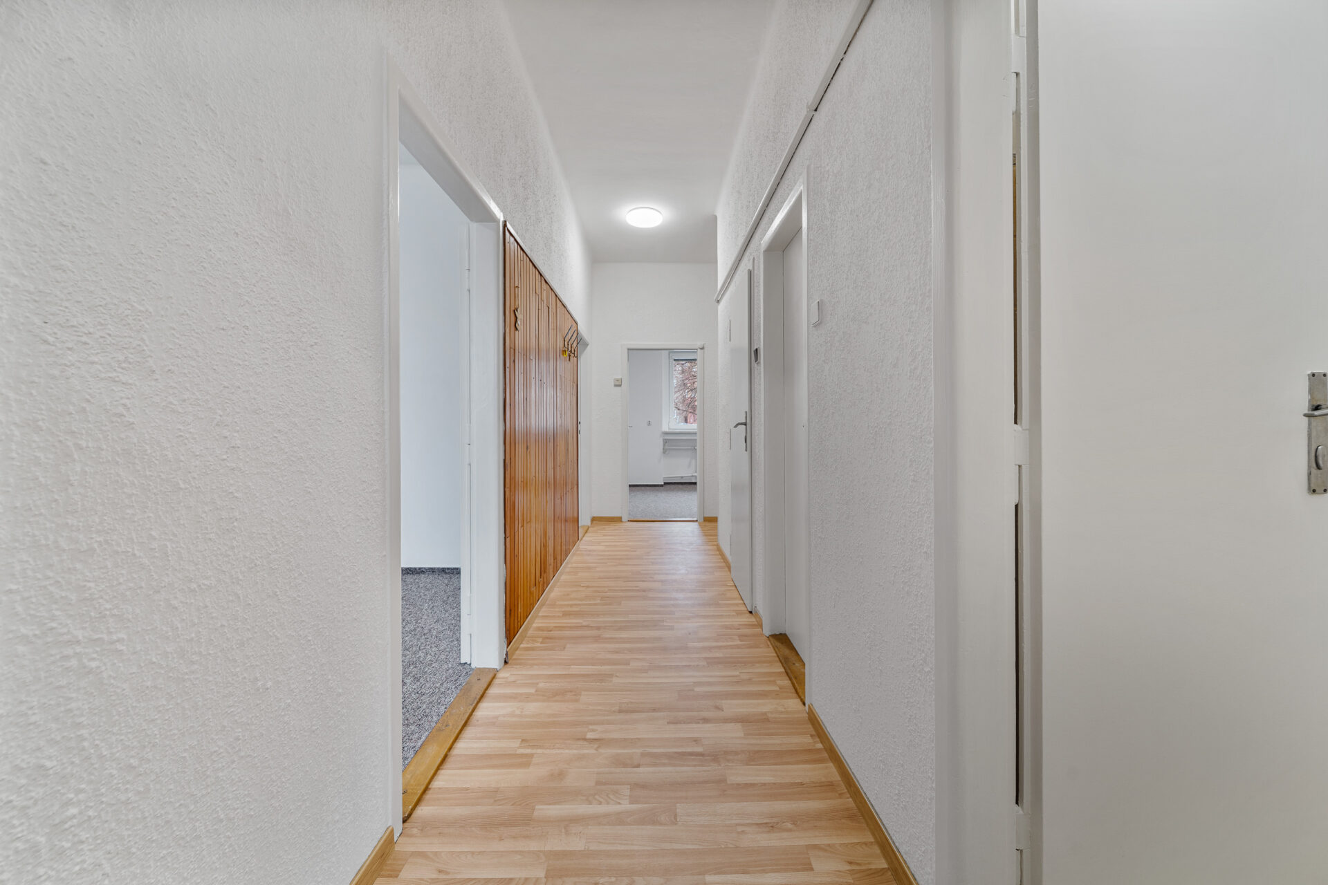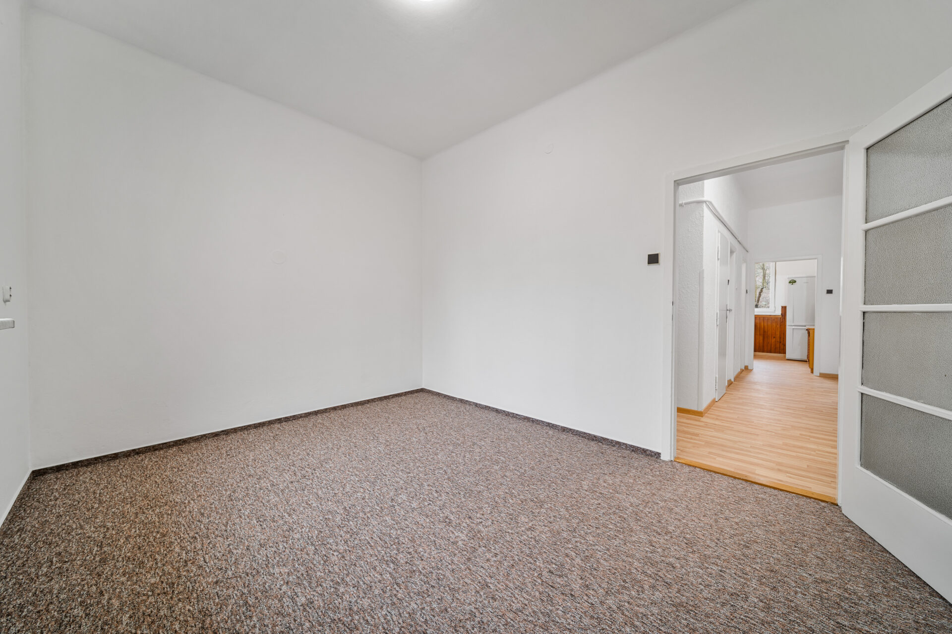 Po vstupu do bytu vás přivítá prostorná chodba. Hned vpravo se nachází první pokoj – pro lepší představu o jeho potenciálu jsme pro vás připravili vizualizaci, jak může prostor vypadat po nastěhování. Rovně z chodby pak vstoupíte do druhého, většího pokoje. Obě tyto místnosti jsou orientovány do klidného vnitrobloku, což z nich činí ideální ložnici a dětský pokoj či pracovnu.