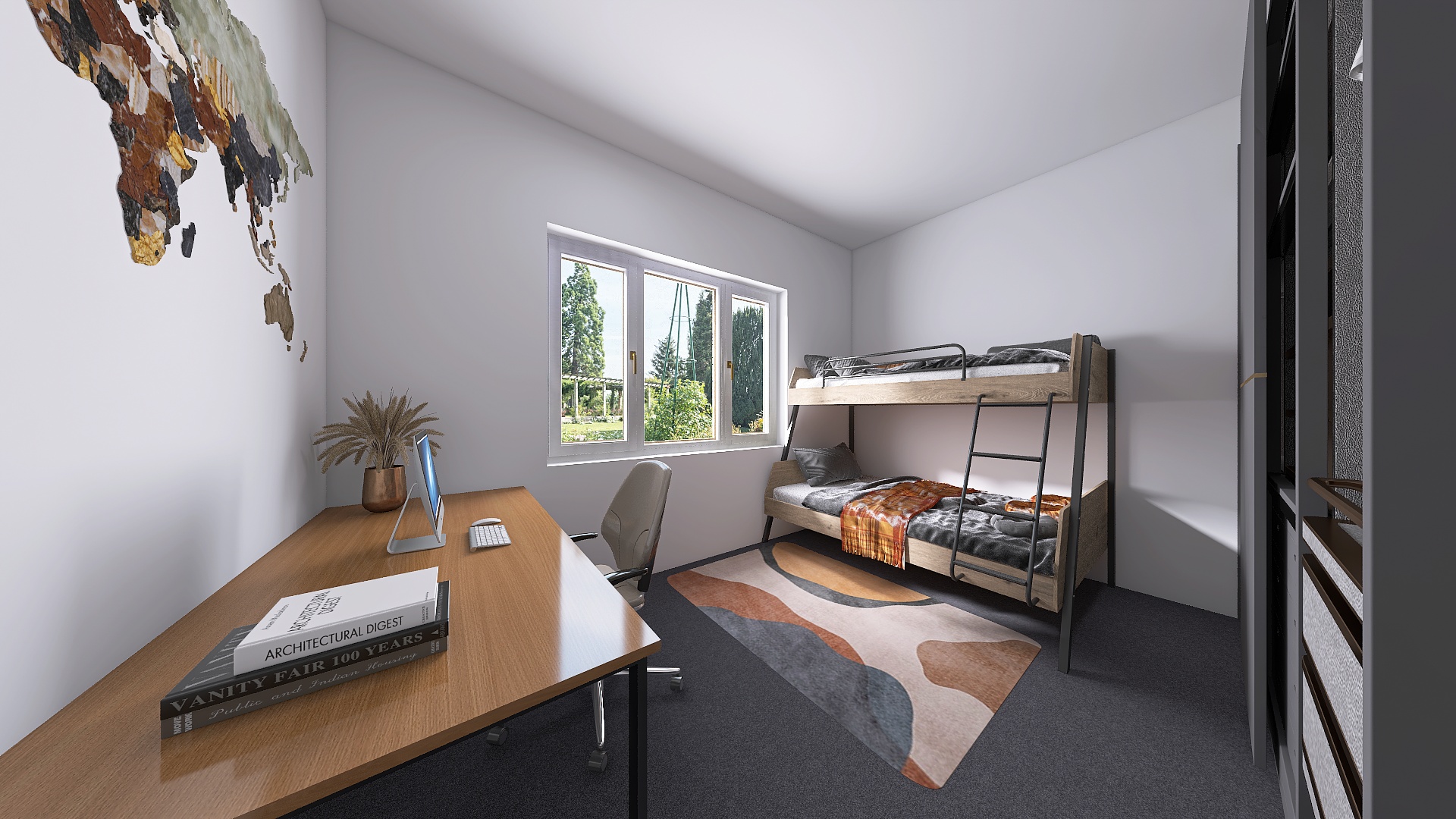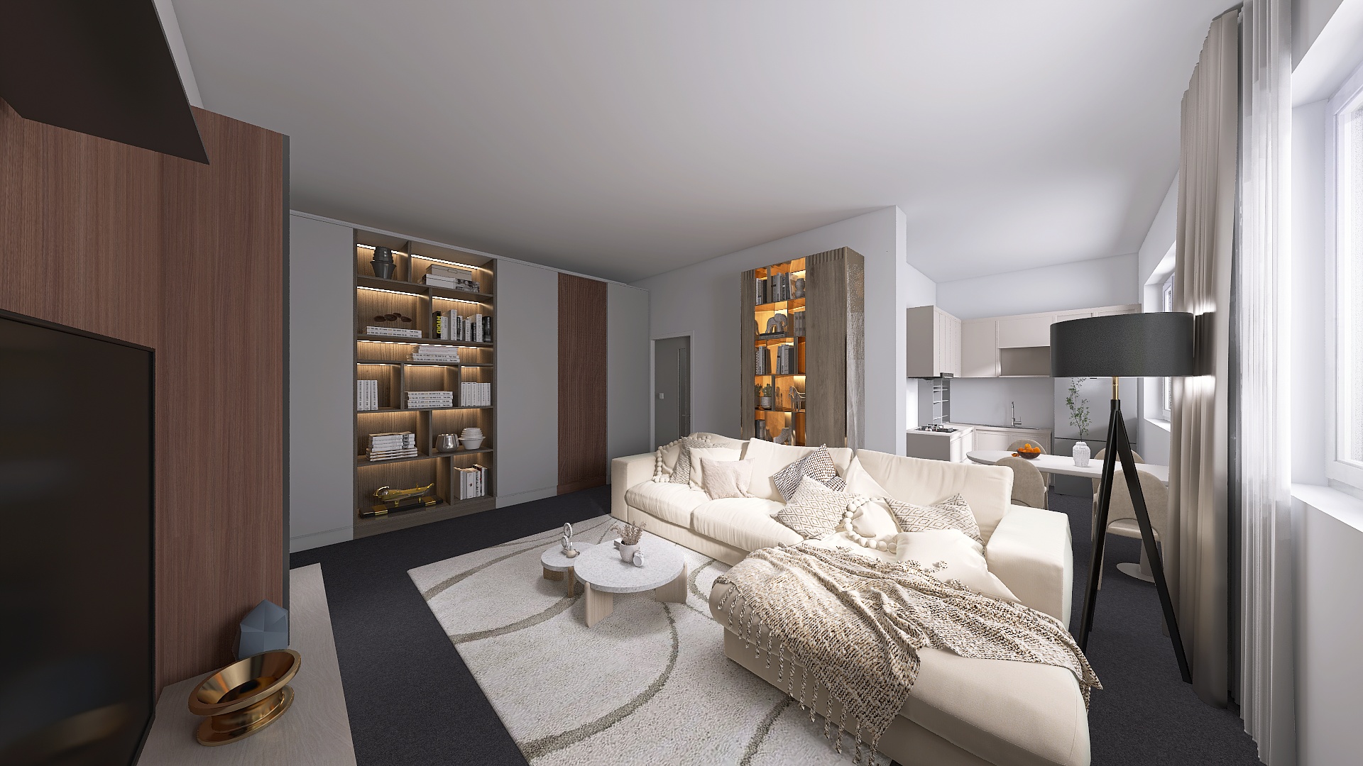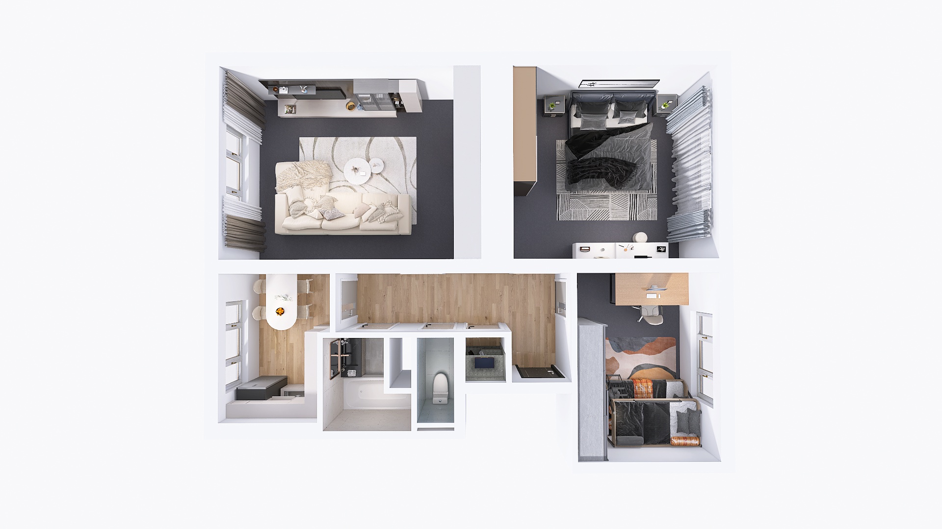 Po vstupu do bytu vás přivítá prostorná chodba. Hned vpravo se nachází první pokoj – pro lepší představu o jeho potenciálu jsme pro vás připravili vizualizaci, jak může prostor vypadat po nastěhování. Rovně z chodby pak vstoupíte do druhého, většího pokoje. Obě tyto místnosti jsou orientovány do klidného vnitrobloku, což z nich činí ideální ložnici a dětský pokoj či pracovnu.