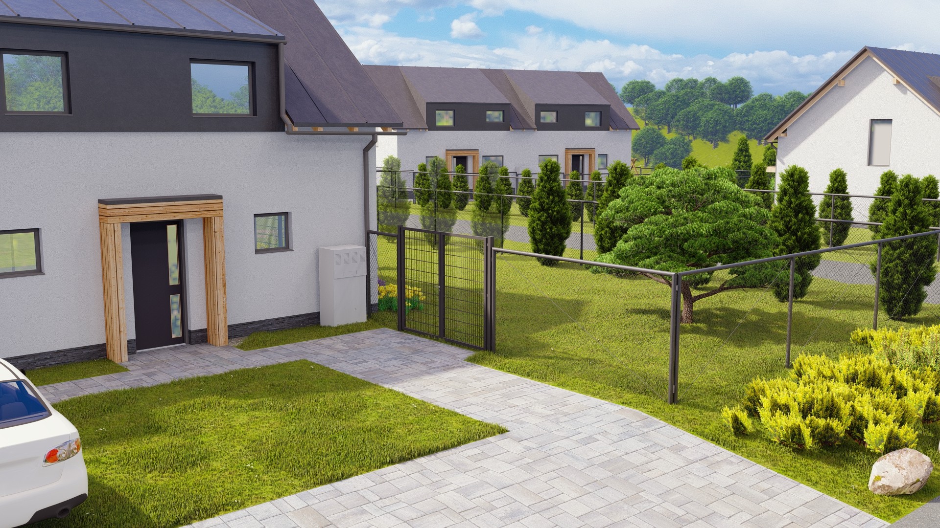 Byt (aktuálně volný byt B) je součástí trojdomu, a díky vlastní zahradě, terase a dvěma parkovacím místům nabízí plnohodnotný komfort srovnatelný s bydlením v rodinném domě. K dispozici je navíc i dobíjecí stanice pro elektromobil.