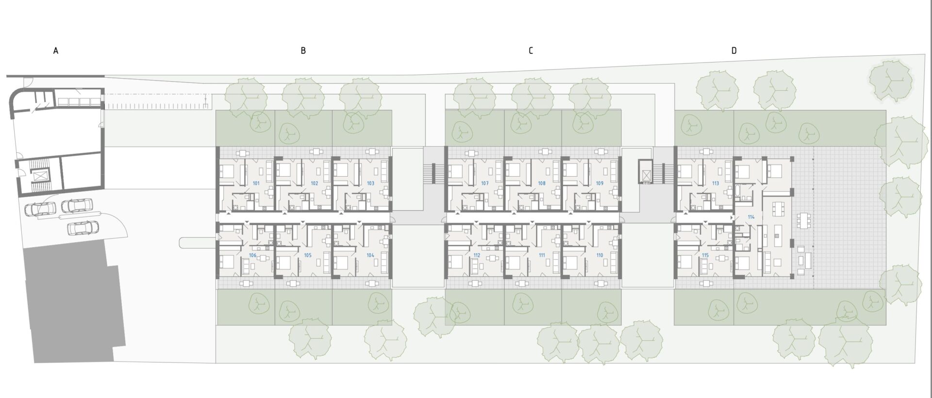 Veškerá parkovací stání jsou řešena v krytých prostorech pod budovou, takže okolí domů zůstává klidné, čisté a bez rušivých prvků. Na projekt navazuje komunitní zahrada, která vytváří přirozený prostor pro setkávání rezidentů i relax.