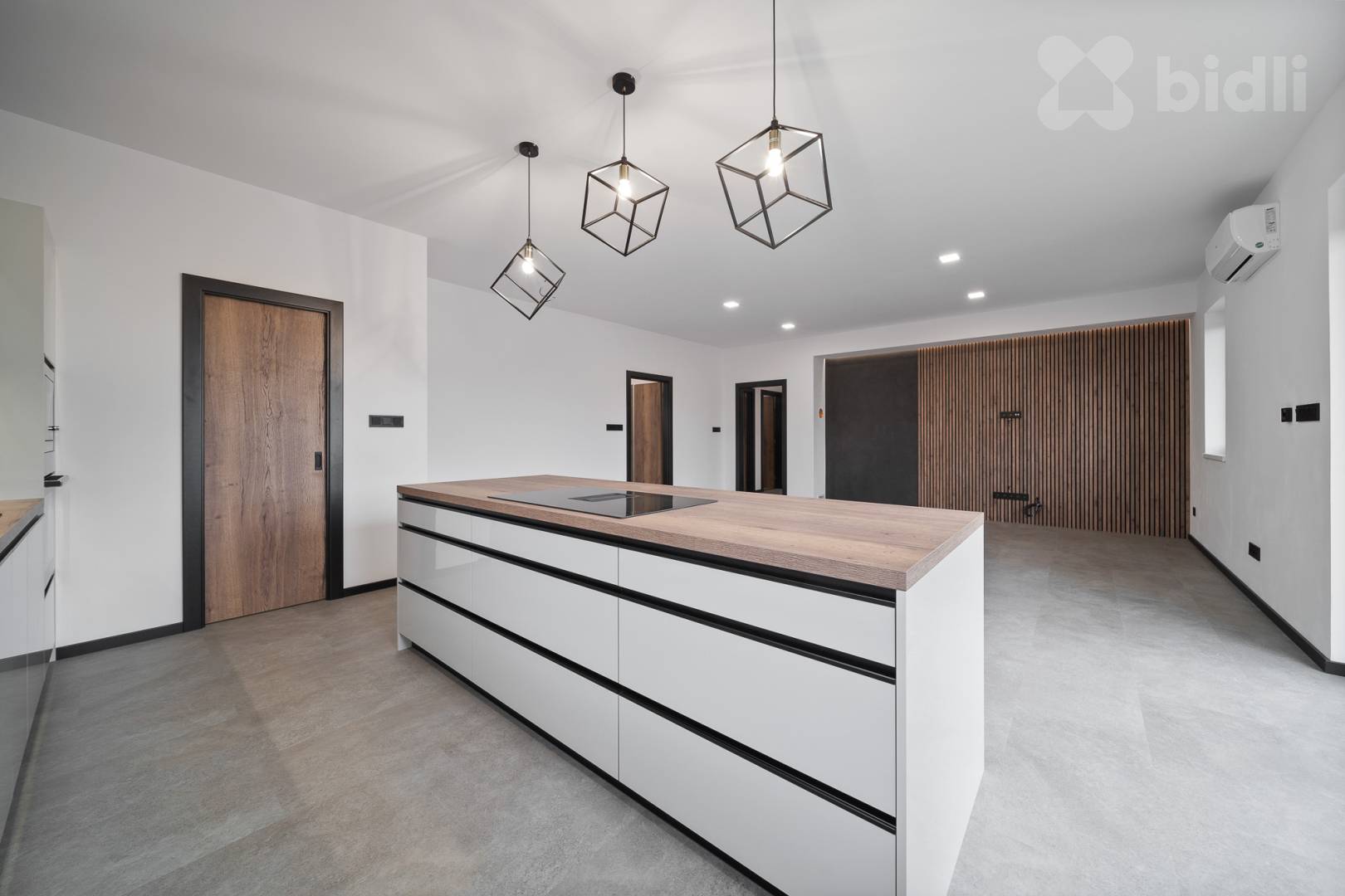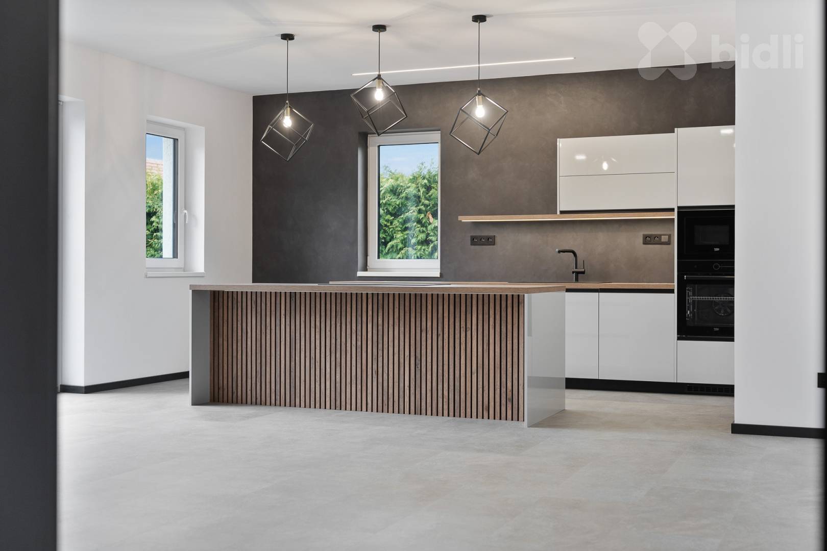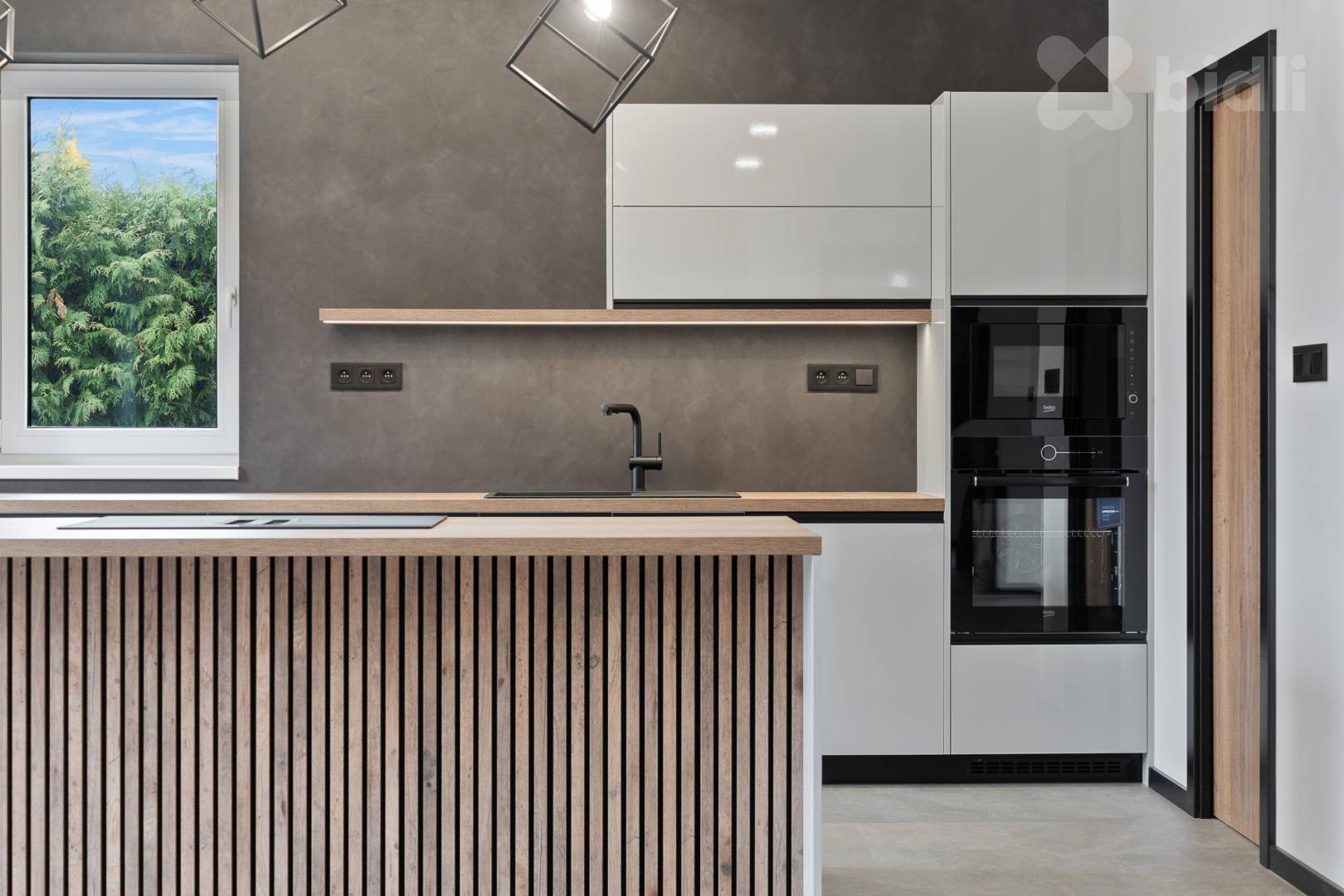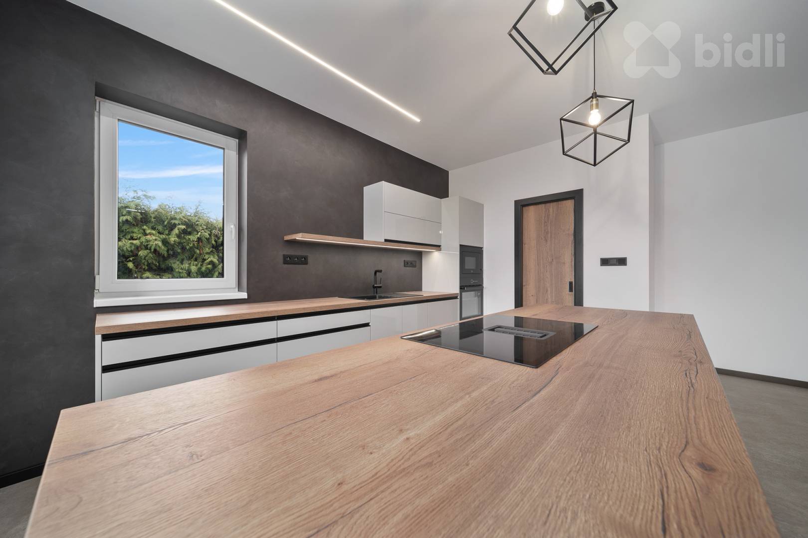Kuchyňská linka je vyrobena na míru a osazena kvalitními spotřebiči (např. Franke – varná deska s integrovaným odsáváním). Velkou výhodou je samostatná spíž přístupná přímo z kuchyně.