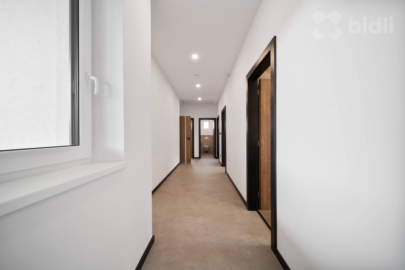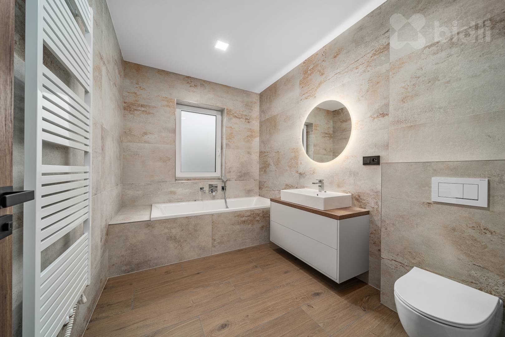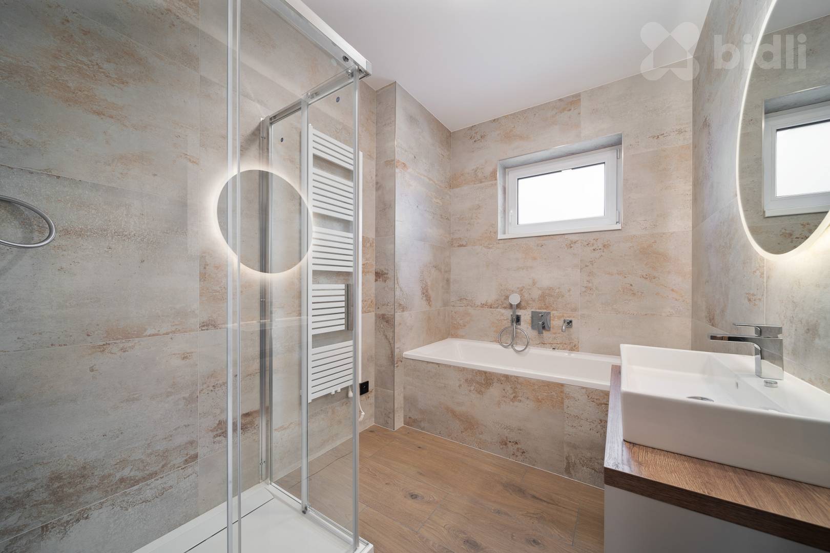 Koupelny jsou provedené ve vysokém standardu: velkoformátové obklady, podomítkové baterie Hansgrohe, keramika Ideal Standard / Vitra, skříňky na míru, zrcadla a elektrická otopná tělesa. Jedna koupelna nabízí sprchu i vanu, druhá nadstandardně velkou vanu + WC.
