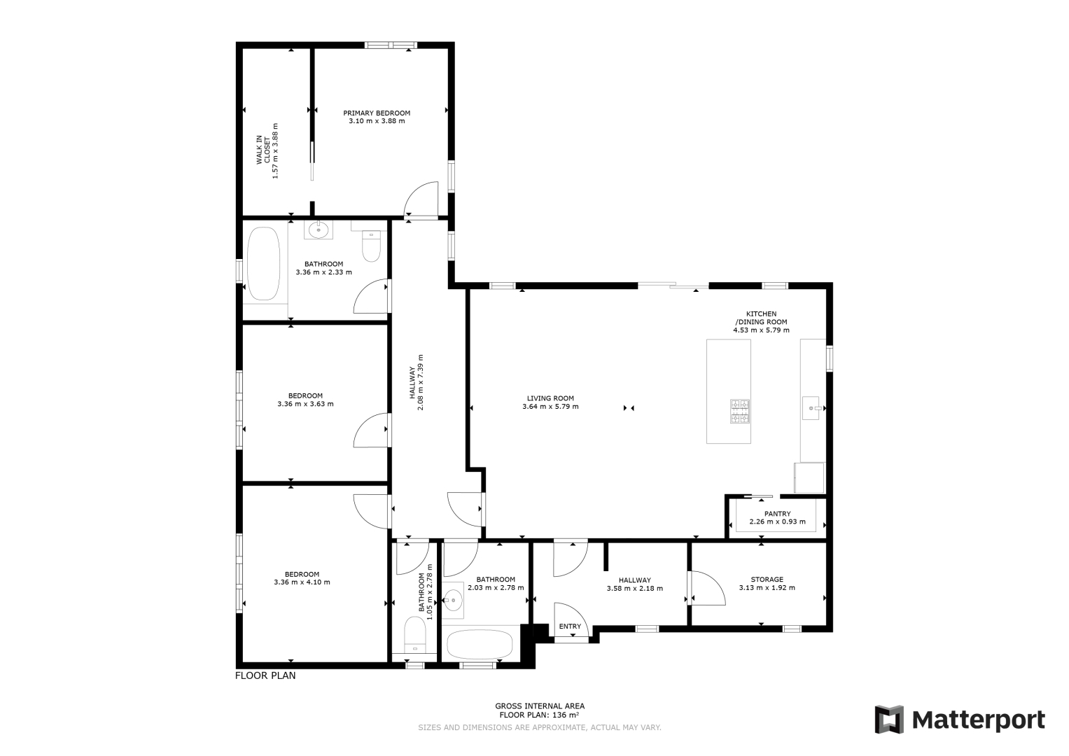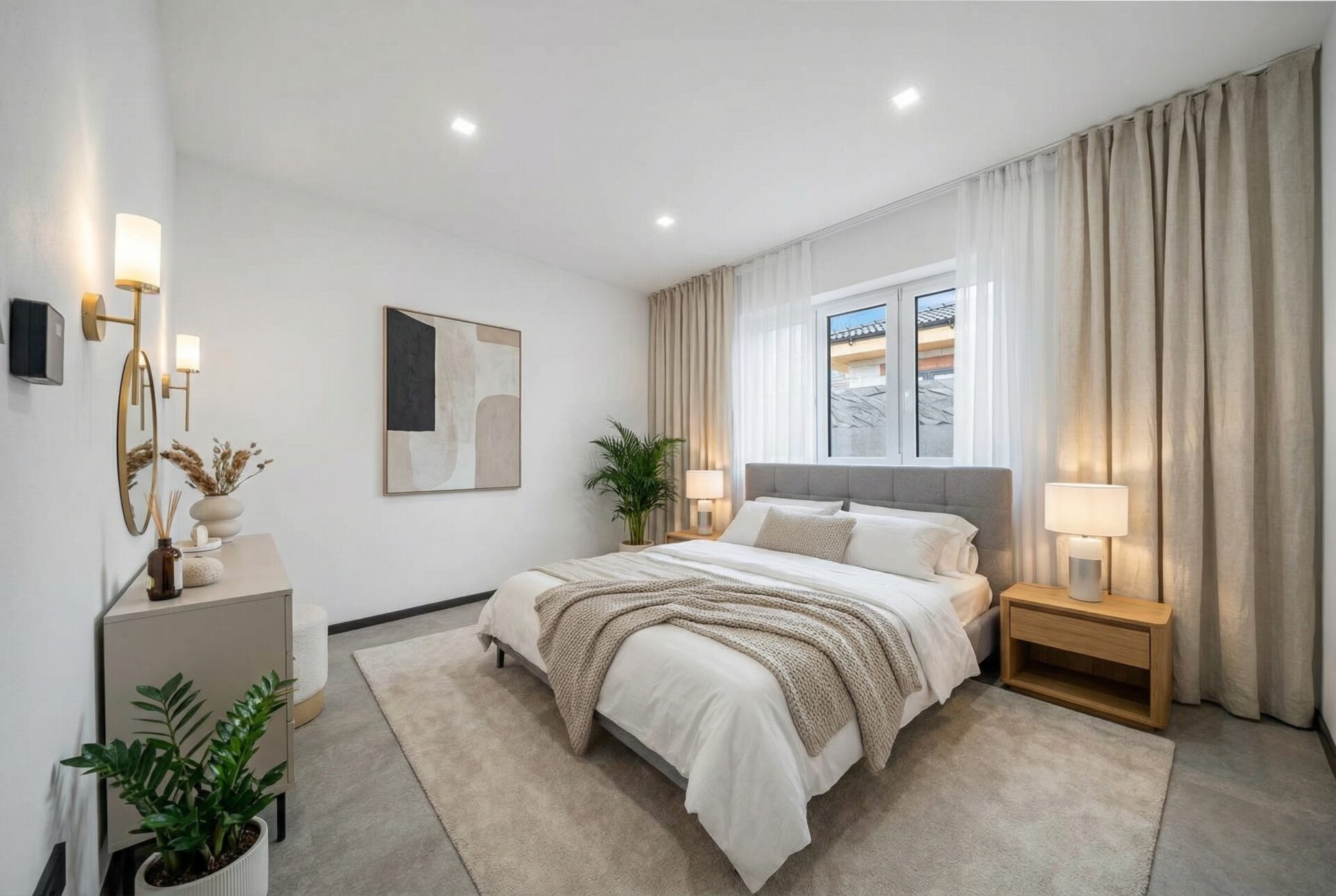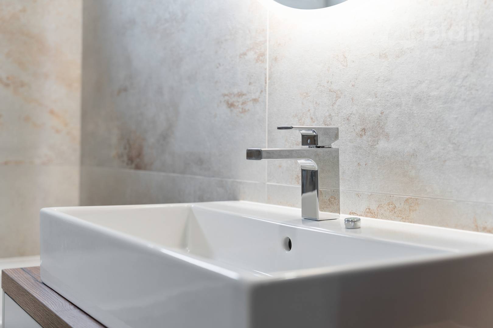 Koupelny jsou provedené ve vysokém standardu: velkoformátové obklady, podomítkové baterie Hansgrohe, keramika Ideal Standard / Vitra, skříňky na míru, zrcadla a elektrická otopná tělesa. Jedna koupelna nabízí sprchu i vanu, druhá nadstandardně velkou vanu + WC.