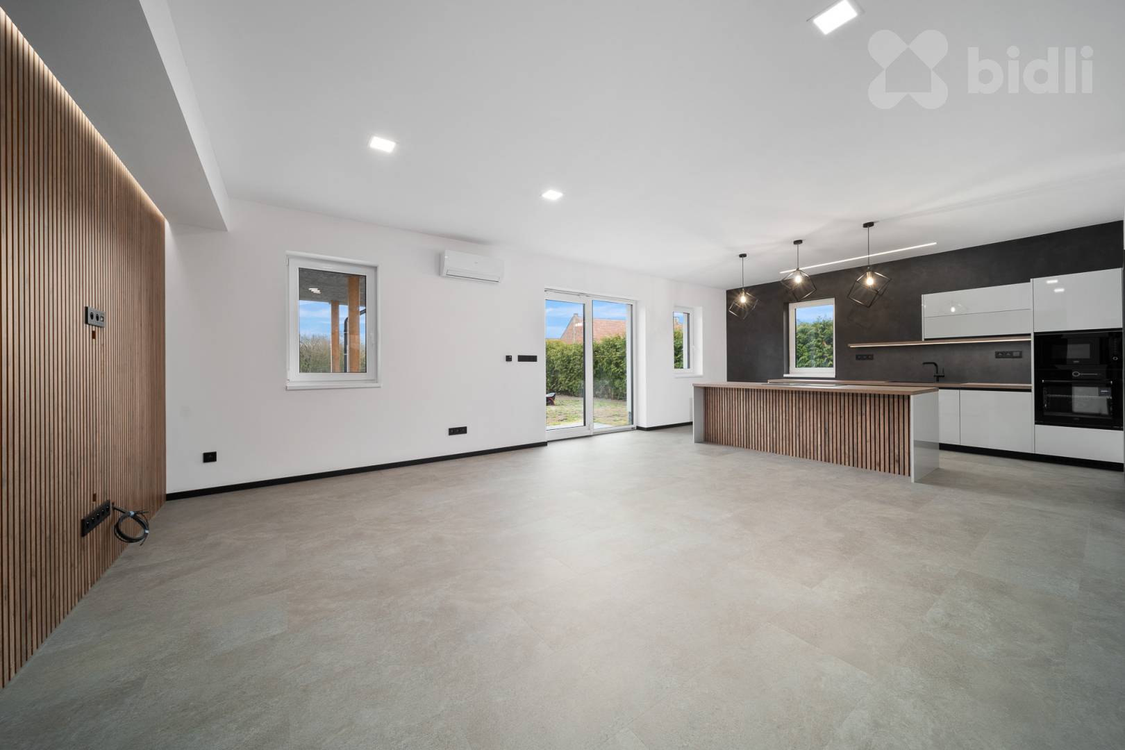 prostorný obývací pokoj s kuchyní a přímým vstupem na krytou terasu,