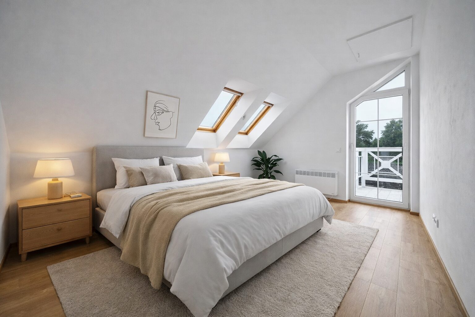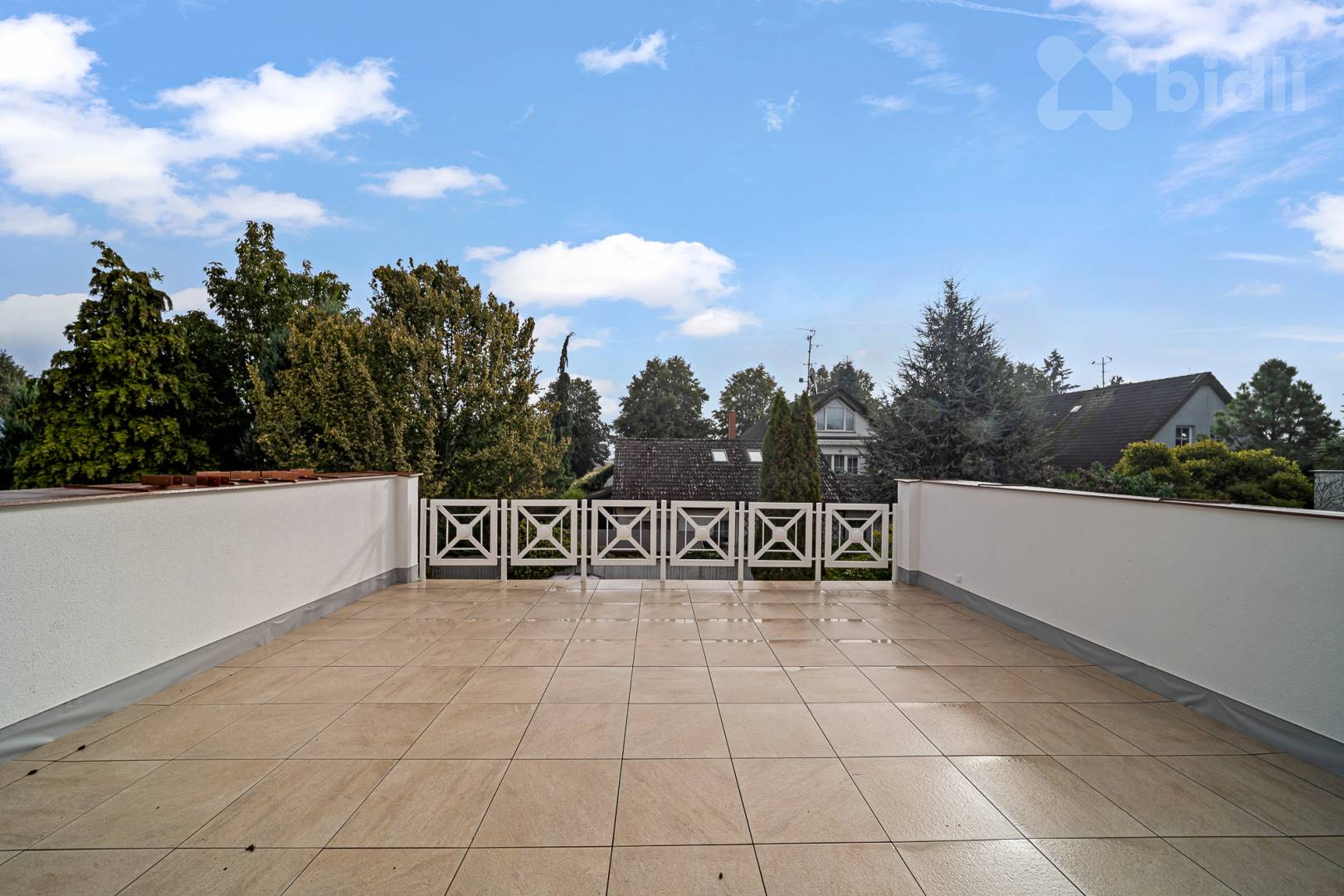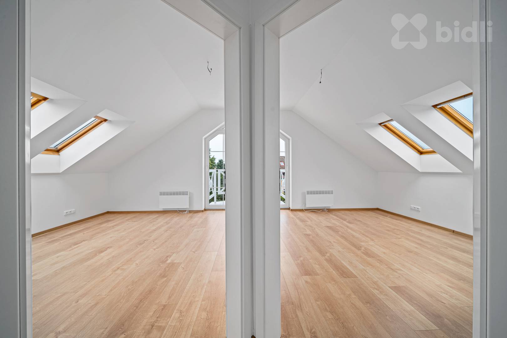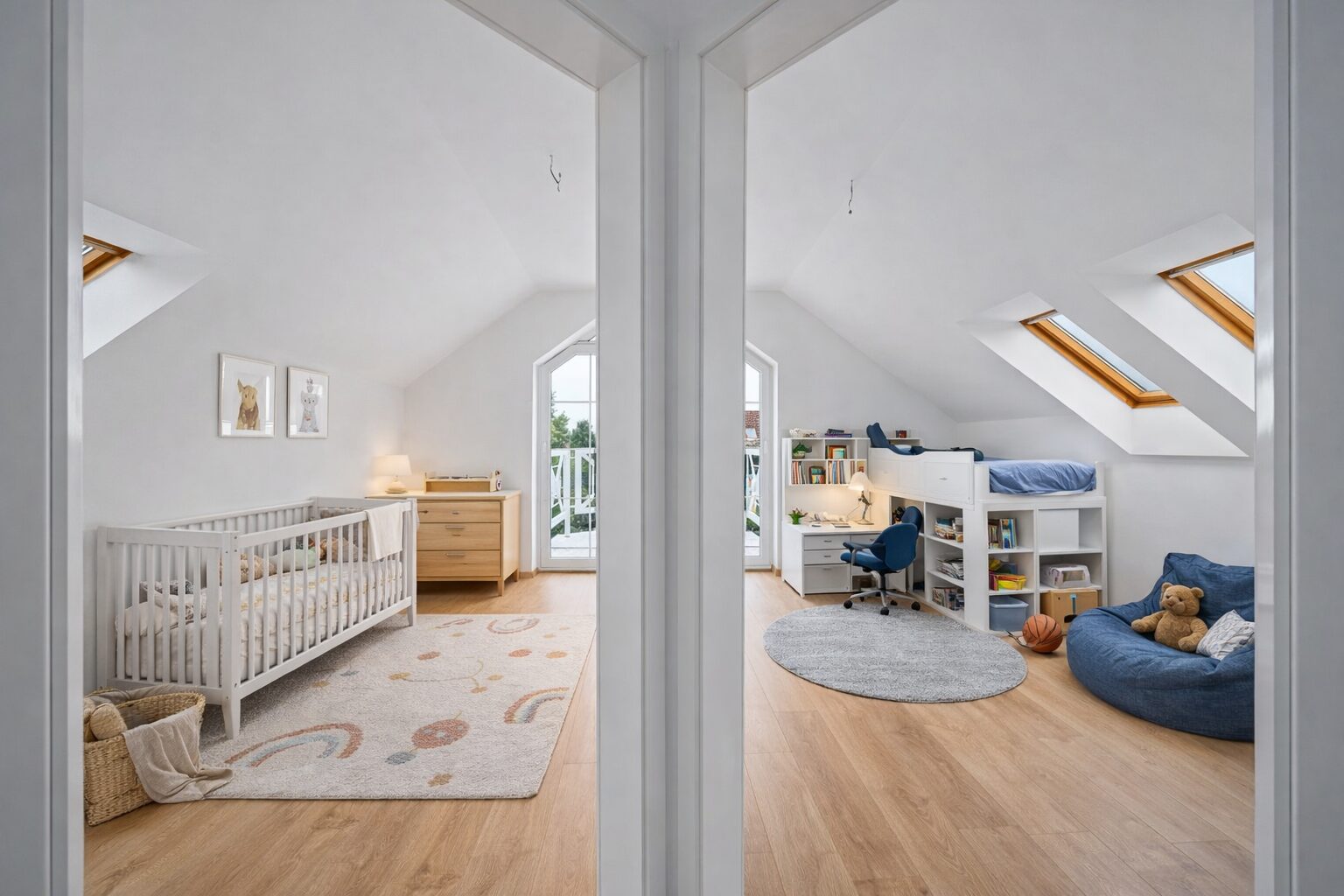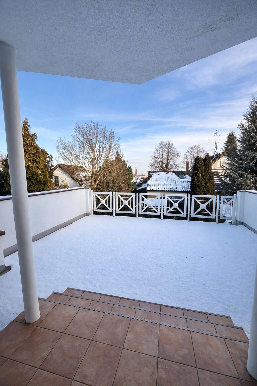 2. patro nabízí čtyři samostatné pokoje, každý se vstupem na menší terasu, koupelnu s vanou, sprchovým koutem a WC a komoru – ideální dispozice pro rodinu s dětmi.
