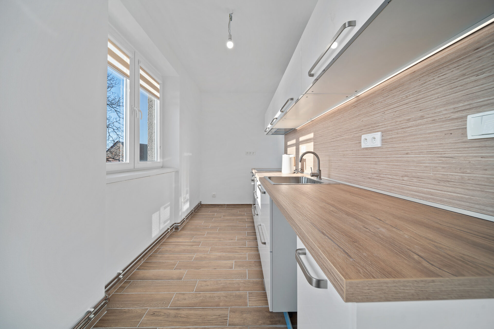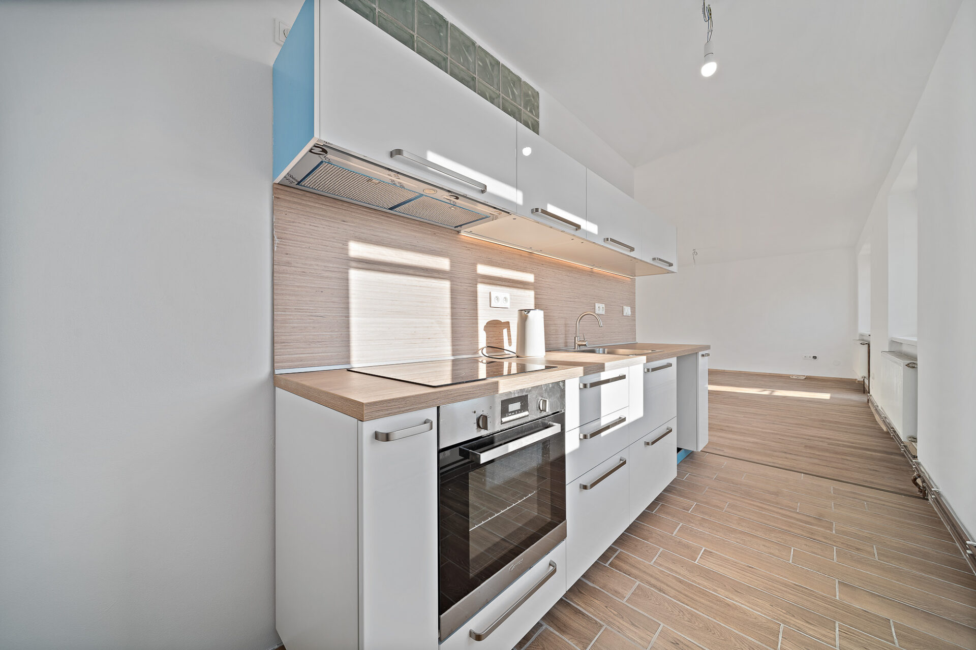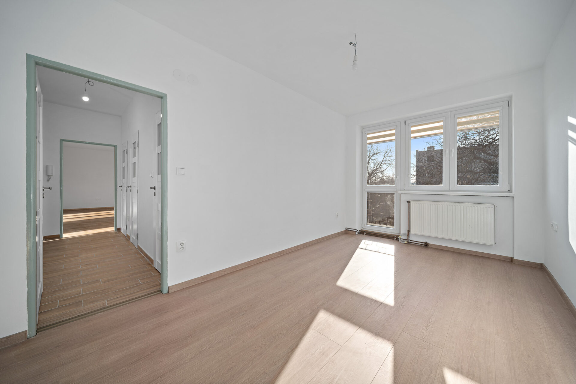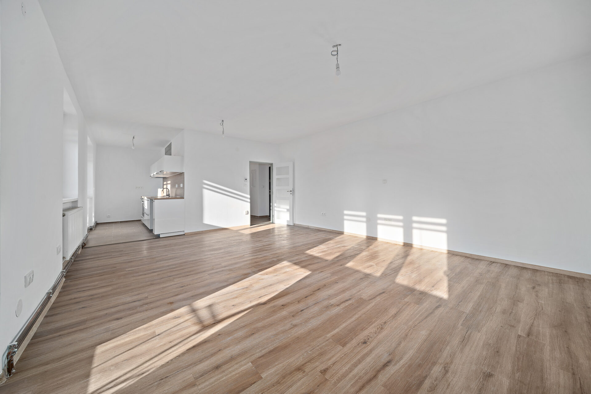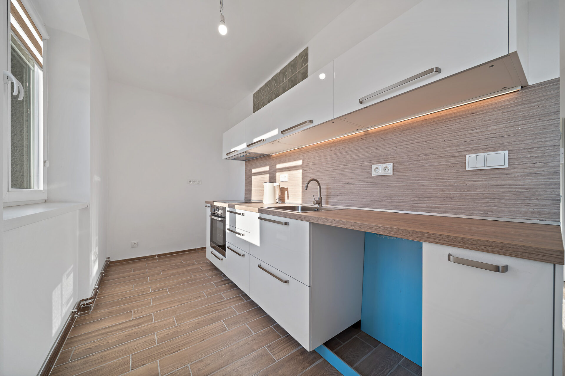 Velkou výhodou je také to, že obývací pokoj lze v případě potřeby jednoduše znovu rozdělit příčkou na dvě samostatné místnosti – např. obývací a dětský pokoj, jak tomu bylo původně. Vytápění bytu je řešeno pomocí nového elektrokotle, ohřev vody zajišťuje bojler.