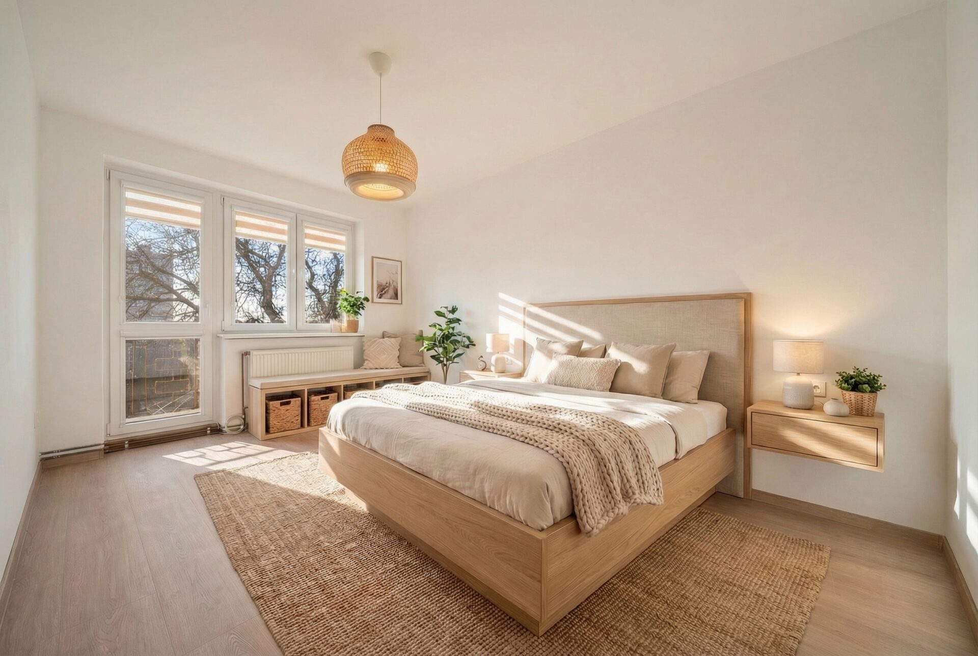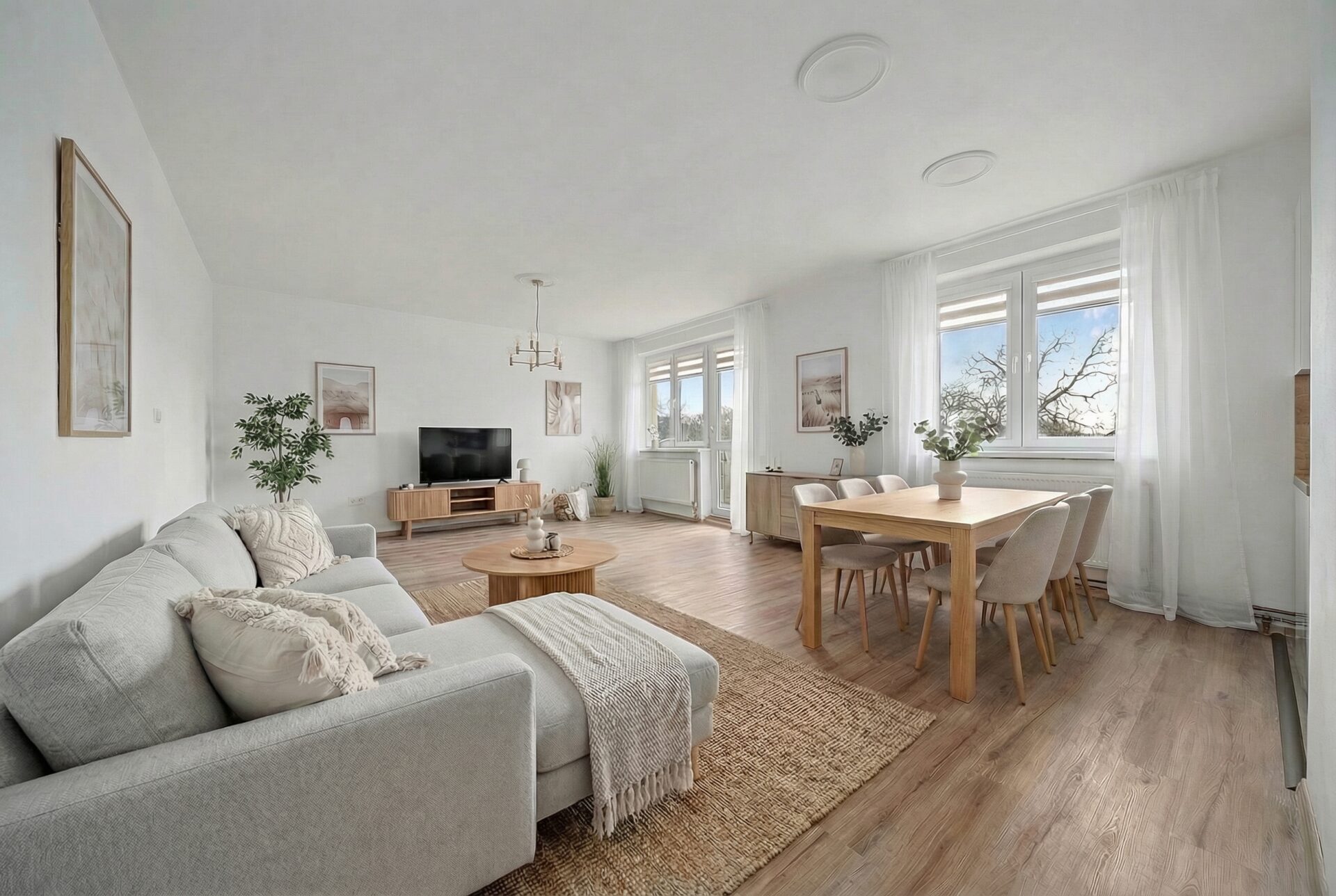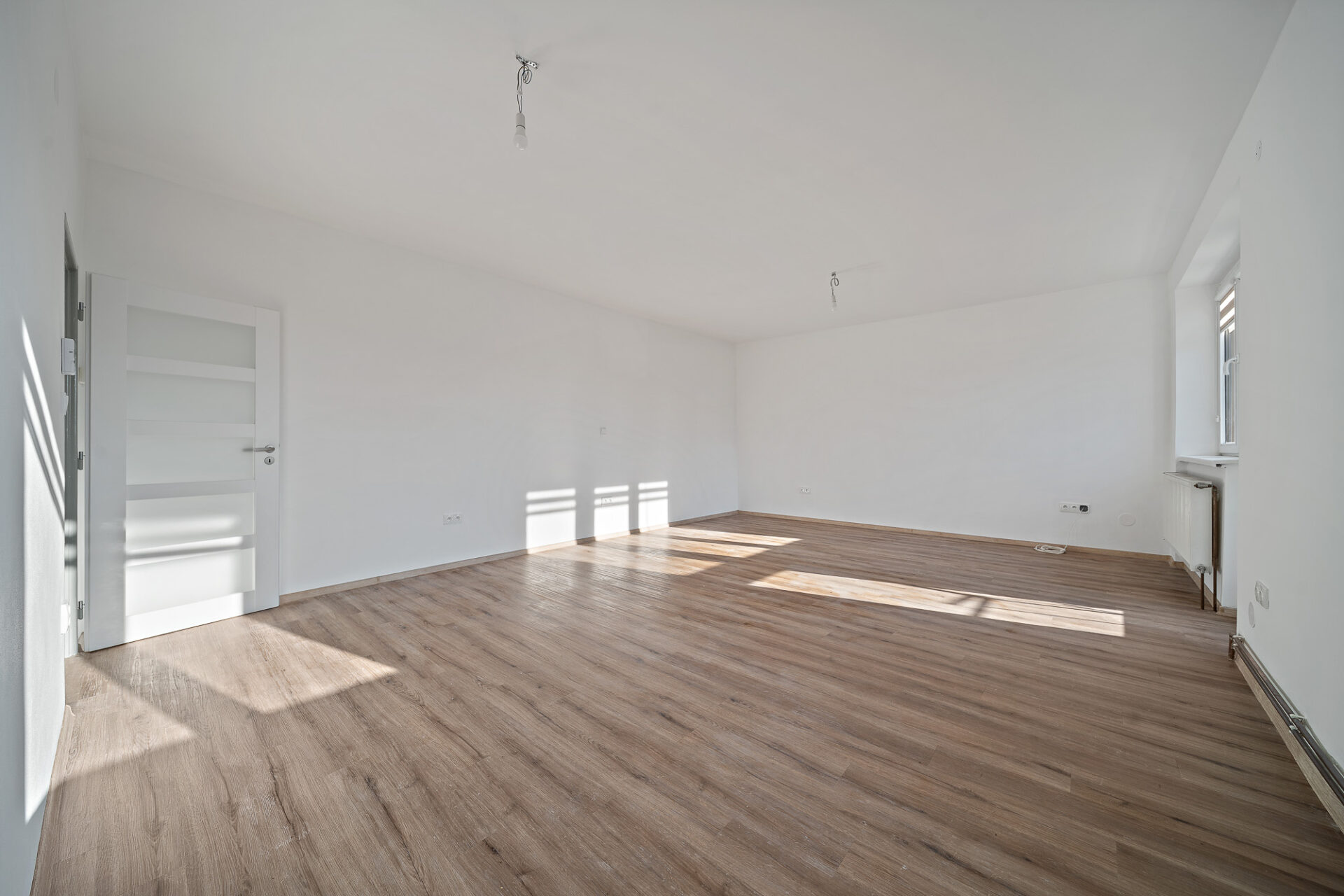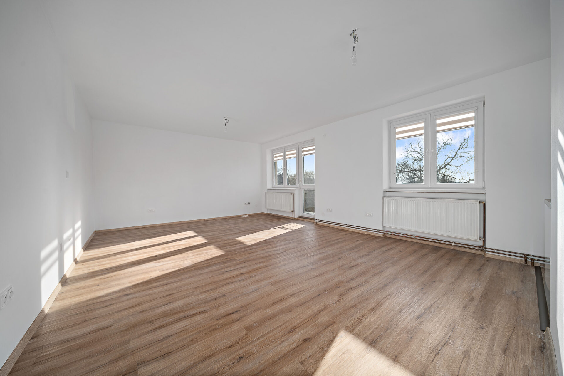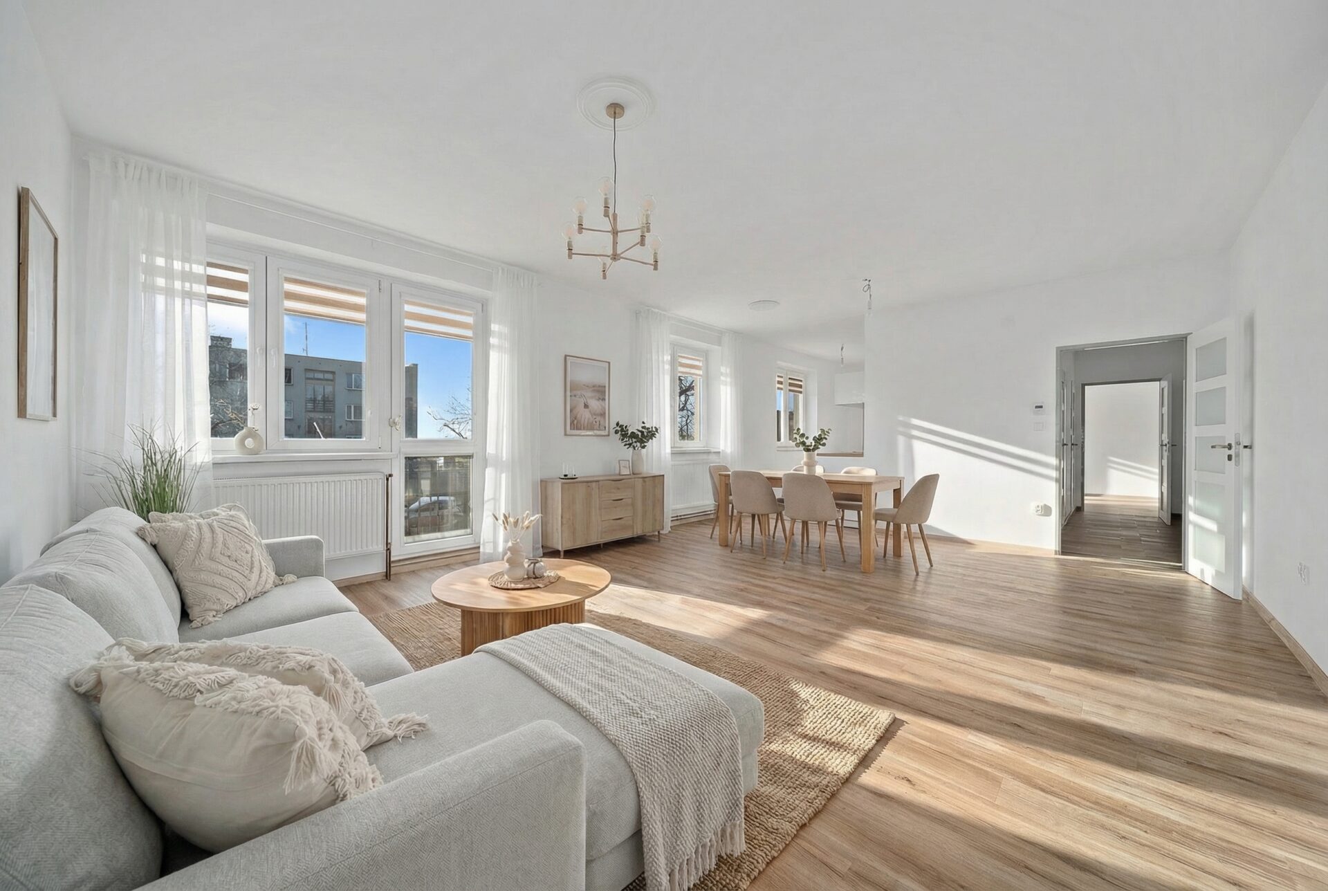 Velkou výhodou je také to, že obývací pokoj lze v případě potřeby jednoduše znovu rozdělit příčkou na dvě samostatné místnosti – např. obývací a dětský pokoj, jak tomu bylo původně. Vytápění bytu je řešeno pomocí nového elektrokotle, ohřev vody zajišťuje bojler.