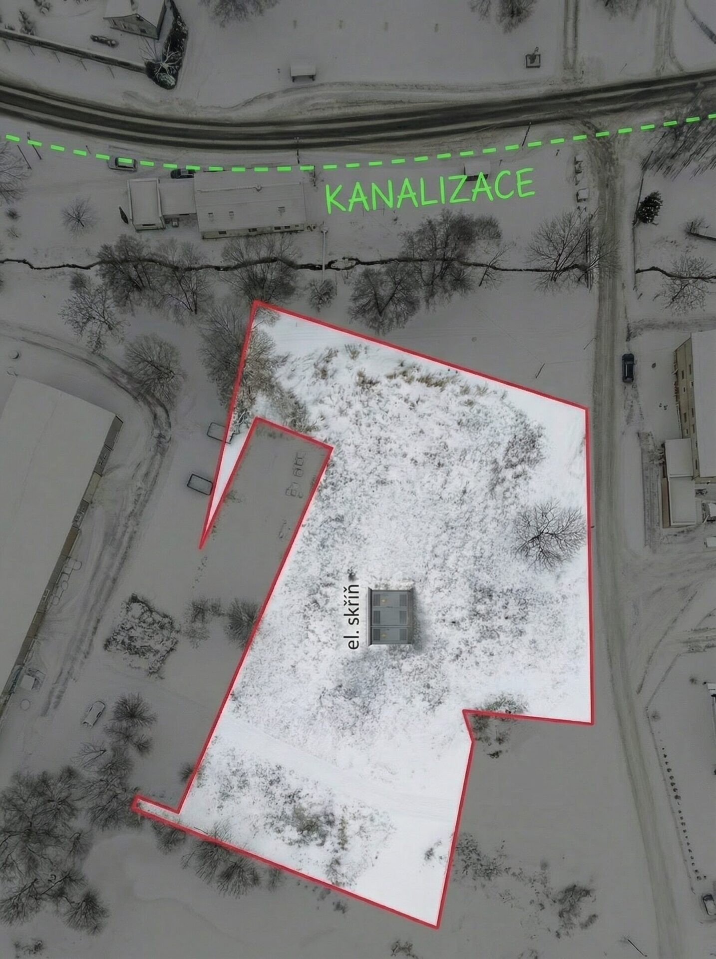 Veřejná kanalizace a vodovod jsou vedeny podél severní hranice pozemku, přímo při komunikaci. Elektro přípojka je dostupná – na pozemku se nachází rozvodový skříň (viz situace). Na pozemek je přístup z obecní komunikace.